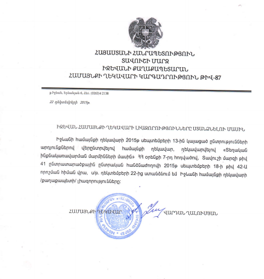 Այսպես, 2015 թվակաի ընտրություններից հետո Խաշթառակ համայնքի ղեկավար Անդրանիկ Վիրաբյանը լիազորությունները ստանձնել է սեպտեմբերի 25-ին, մինչդեռ Իջևանի ղեկավար Վարդան Ղալումյանը համայնքի ղեկավարի լիազորությունները ստանձնել է դեկտեմբերի 22-ին։ Պաշտոնի ստանձման այս տարբերությունը կապված է այն հանգամանքով, որ Իջևանում կայացած նախորդ ընտրություններից հետո ղեկավարը իր լիազորությունները ստանձնել է դեկտեմբերի 22-ին։ Վերջինս չէր կարող ստանձնել լիազորություններն ավելի վաղ, քան նախորդ պաշտոնավարման ժամկետի լրացումն է։