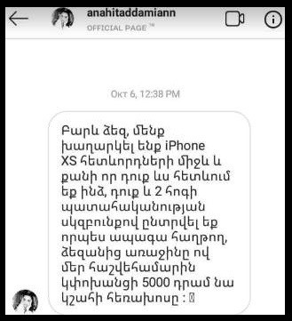 Ինստագրամի հայկական տիրույթում գործում էր @anahitaddamiann անունով կեղծ օգտահաշիվ, որը խաբեությամբ գումարներ էր փորձում շորթել քաղաքացիներից։ Կեղծարարը նամակով հայտնում էր իր հետևորդներին, որ նրանք շահել են էջի կողմից խաղարկվող iPhone XS բջջային հեռախոսը, իսկ մրցանակը ստանալու համար առաջարկում էր 5000 դրամ փոխանցել իր հաշվեհամարին։