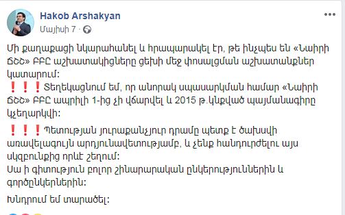 Ինչ վերաբերում է Հակոբ Արշակյանի «հայտարարությանը», թե «Նաիրի ՃՇՇ» ԲԲ ընկերության բանվորներին զրկելու է աշխատավարձից, ապա հարկ ենք համարում նշել, որ Հակոբ Արշակյանը նման հայտարարություն անել չէր կարող, քանի որ նախարարությունը «Նաիրի ՃՇՇ» շինարարական կազմակերպության բանվորների աշխատավարձի վճարման հետ որևէ առնչություն չունի։ Աշխատավարձերի վճարումն իրականացվում է գործատուի կողմից («Նաիրի» շինարարական կազմակերպության կողմից):