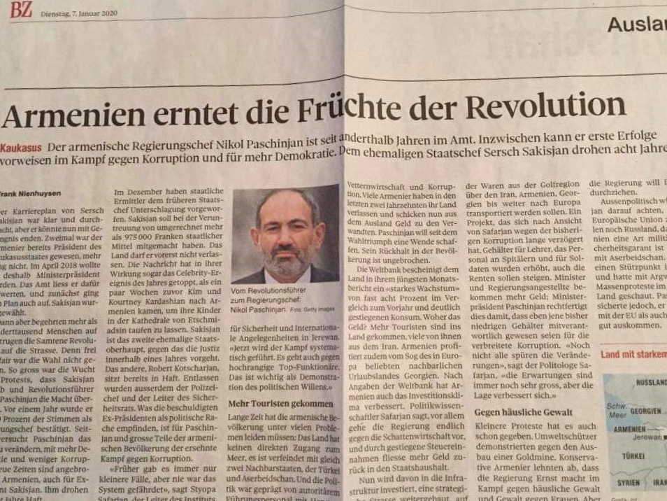 Շվեյցարական «Berner Zeitung» թերթը իր՝ հունվարի 7-ի համարում ծավալուն հոդվածով անդրադարձել էր Հայաստանին։ «Հայաստանը քաղում է հեղափոխության պտուղները» վերտառությամբ հոդվածում թերթն անդրադարձել էր երկրում տեղի ունեցած հեղափոխությանը և դրա արդյունքներին՝ գնահատելով դրանք դրական։