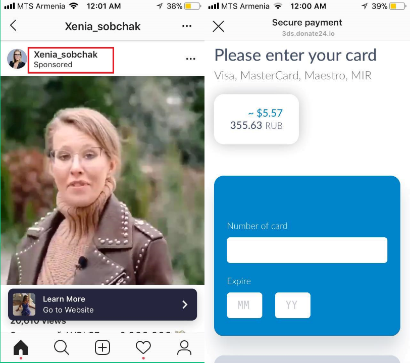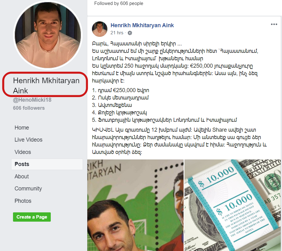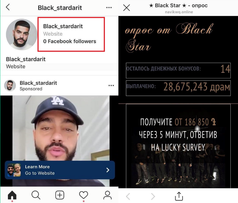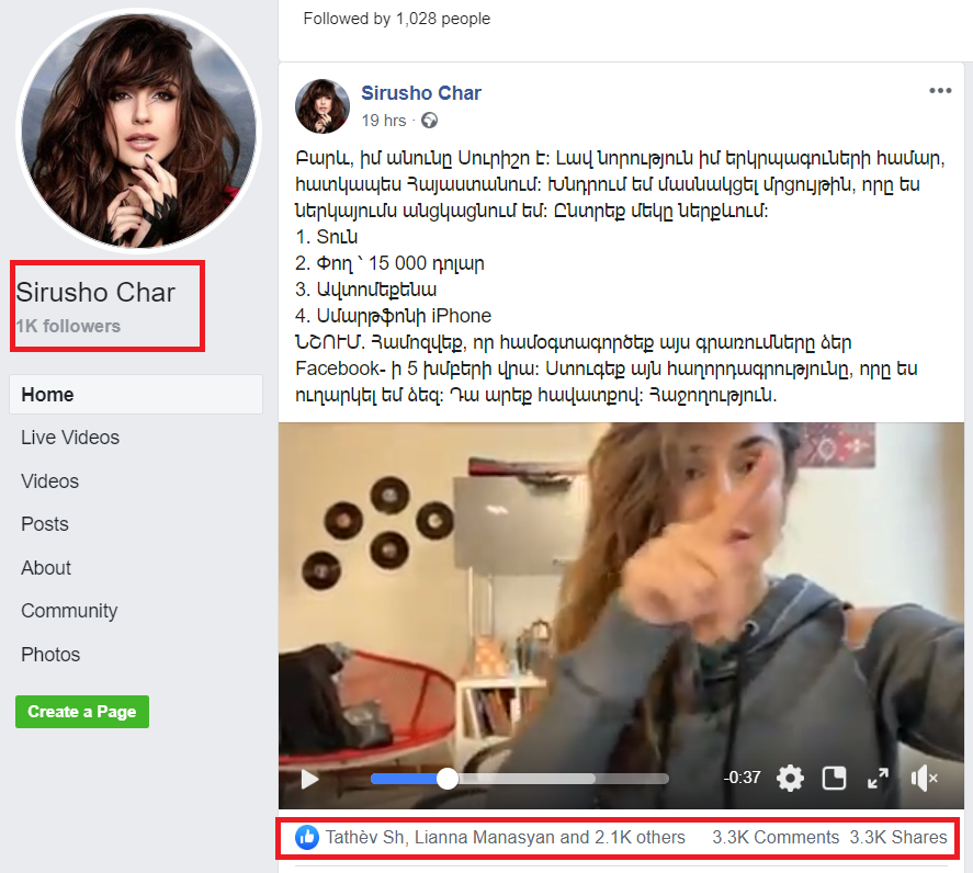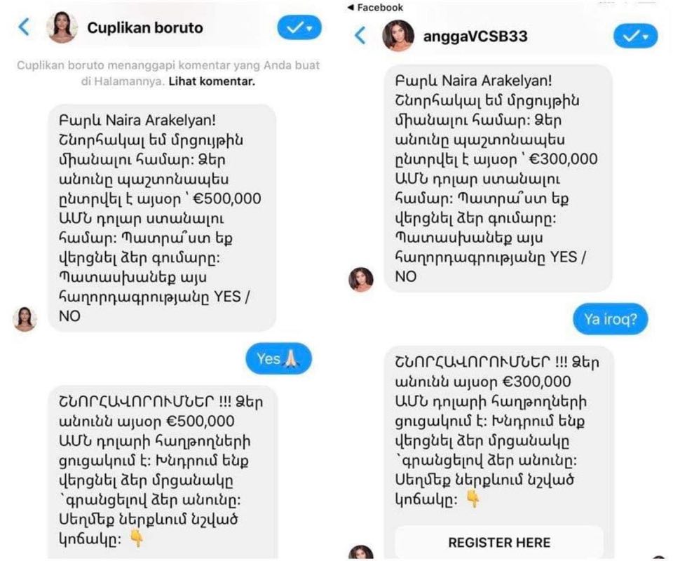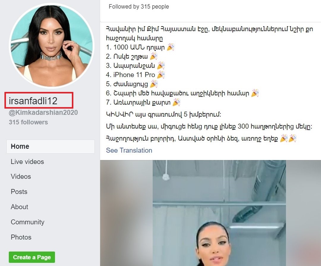 Facebook-ի հայկական տիրույթում գործում են Քիմ Քարդաշյանի, Սիրուշոյի, Հենրիխ Մխիթարյանի, իսկ Instagram-ում՝ Քսենյա Սոբչակի, հումորիստ, հաղորդավար Մաքսիմ Գալկինի, ինչպես նաև ռեփեր Տիմատիի անուններով բացված կեղծ էջեր։ Արժանահավատության համար՝ այս էջերը օգտագործում են աստղերի կողմից նախկինում իրականացված խաղարկությունների տեսնայութերն ու գրառումները։