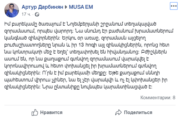 Այսօր մի շարք օգտահաշիվներ կրկին հարձակման են են ենթարկվել։ Նաիրա Գրիգորյան անունով օգտատիրոջ էջում փոխել են նրա գլխավոր լուսանկարը` տեղադրելով ՊՆ մամուլի խոսնակ Շուշան Ստեփանյանի լուսանկարը և տեղեկություն տարածել, թե ՀՀ զորամասերից մեկում ծառայողի, իր բարեկամին և նրա 13 զինակիցներին, որոնց հետ կոնտակտ է ունեցել, տեղափոխել են հիվանդանոց: Ըստ տեղեկության՝ ծառայողի բարեկամը զորամասում տարածել է կորոնավիրուս՝ փոխանցելով այն մինչև անգամ խրամատներում գտնվող զինակիցներին: