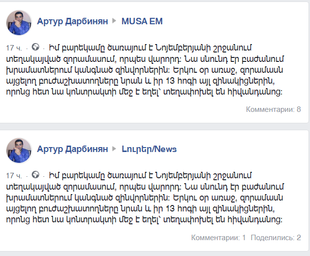 Բացի այս գրառումից` էջում հրապարակվել են մի շարք այլ կեղծ տեղեկություններ, որոնցից մեկը Լեռնային Ղարաբաղի պաշտպանության բանակի հյուսիսում գտնվող զորամասերից մեկում 19-ամյա զինվորի մահվան մասին։