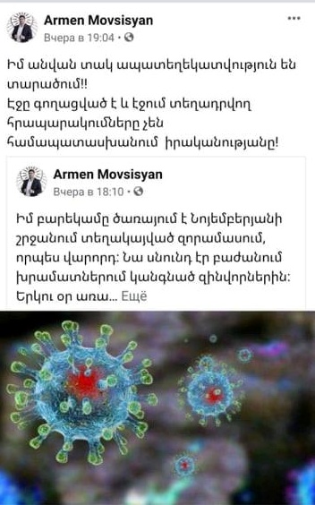 Ընթերցողներին խորհուրդ ենք տալիս հետևել միայն պաշտոնական լրահոսին, իսկ կորոնավիրուսի մասին տարածվող կեղծ լուրերի հերքումներին կարող եք ծանոթանալ Տեղեկատվության ստուգման կենտրոնի COVID-19 բաժնում։