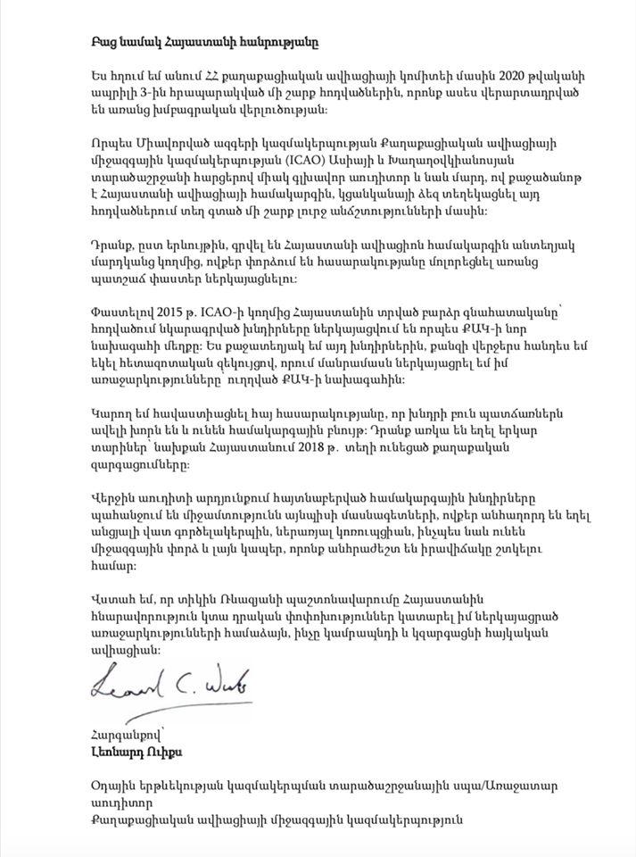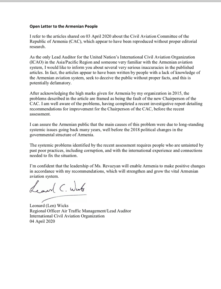 Կից ներկայացնում ենք նաև Քաղաքացիական ավիացիայի միջազգային կազմակերպության Տարածաշրջանային պատասխանատու, օդային երթևեկության կառավարման/գլխավոր աուդիտոր Լեոնարդ Վիքսի բաց նամակը Հայաստանի հասարակությանը։