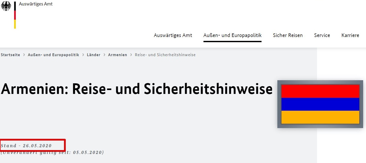 Խոսքն այստեղ գնում է Գերմանիայի ԱԳՆ պաշտոնական կայքէջում ճամփորդական խորհուրդների մասին, որտեղ նմանօրինակ խորհրդատվություններ առկա են եղել տարիներ, նույնիսկ՝ տասնամյակներ շարունակ։