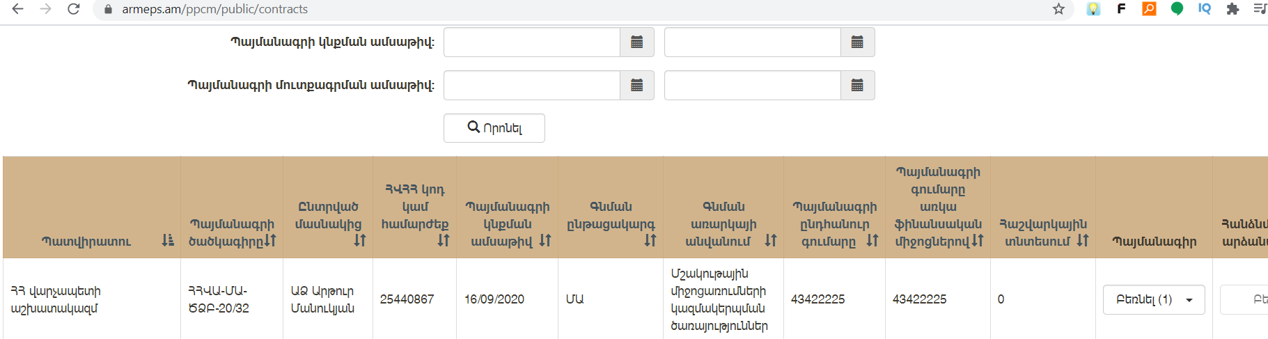 Այսպես՝ «Armeps» էլեկտրոնային հարթակում տեսնում ենք, որ Վարչապետի աշխատակազմը 2020 թվականի սեպտեմբերի 16-ին մոտ 43 մլն դրամի գնման պայմանագիր է կնքել Արթուր Մանուկյան ԱՁ-ի հետ (ՀՎՀՀ 25440867)։ Առկա է ընկերության հասցեն, բանկային հաշիվը և այլն։
