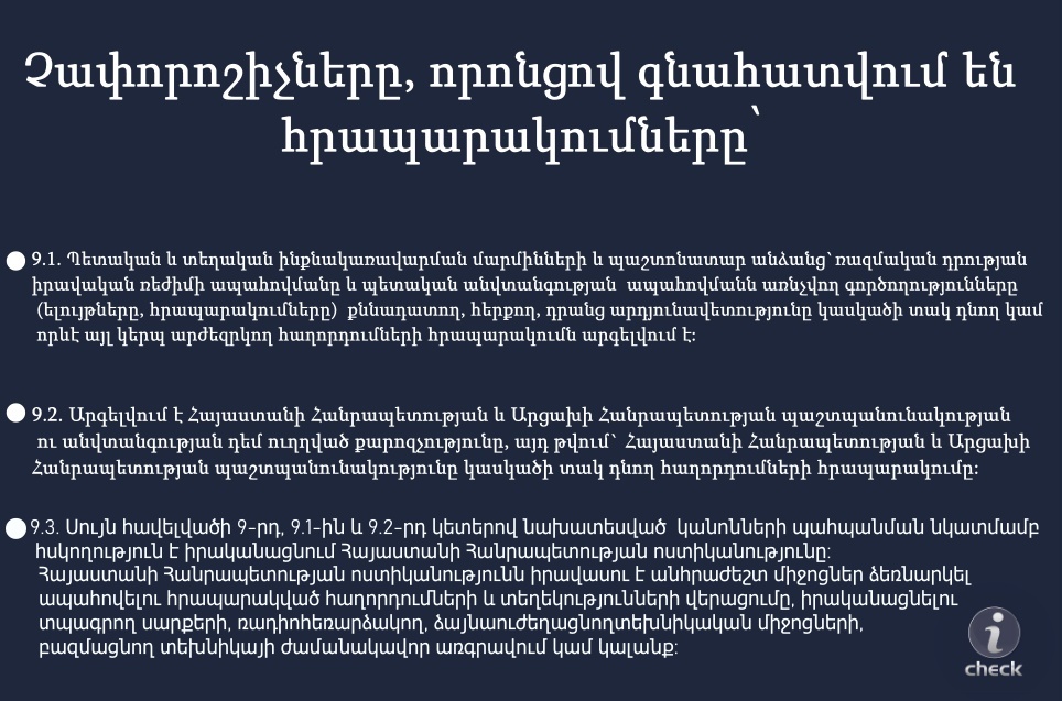 Ի պատասխան հարցման՝ ոստիկանությունը նշել էր, որ հրապարակումների գնահատումը կատարվում է՝ հիմք ընդունելով կառավարության սեպտեմբերի 27-ին ընդունված՝ «ՀՀ-ում ռազմական դրության մասին» թիվ 1586-Ն որոշման 9.1 և 9.2 կետերը։ Լրատվակայքը, եզրակացրել էր, թե հարցմանը պատասխանելիս ոստիկանությունը հղում է արել Կառավարության որոշման՝ գոյություն չունեցող կետերի։