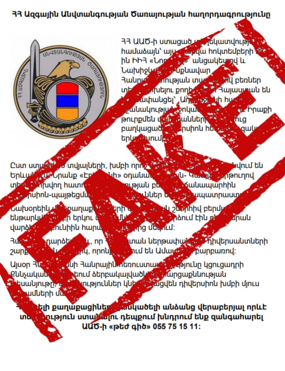 Սոցցանցերում ՀՀ Ազգային անվտանգության ծառայության անունից տարածվում է կեղծ հայտարարություն, ըստ որի՝ Իրանի Իսլամական Հանրապետությունից բեռներ տեղափոխելու պատրվակով Հայաստանի տարածք են ներթափանցել Ադրբեջանի հատուկ նշանակության երկու ահաբեկչական խումբ` բաղկացած տասնմեկ հոգուց։