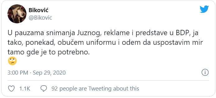 Bikovic then tried to make a joke by writing that he "sometimes, during breaks in shooting, ads and BDP plays, puts on a uniform and goes to establish peace where necessary." He added: "Now seriously: I don't know why you posted a photo from a film set... ridiculous, and not serious for a very serious topic."