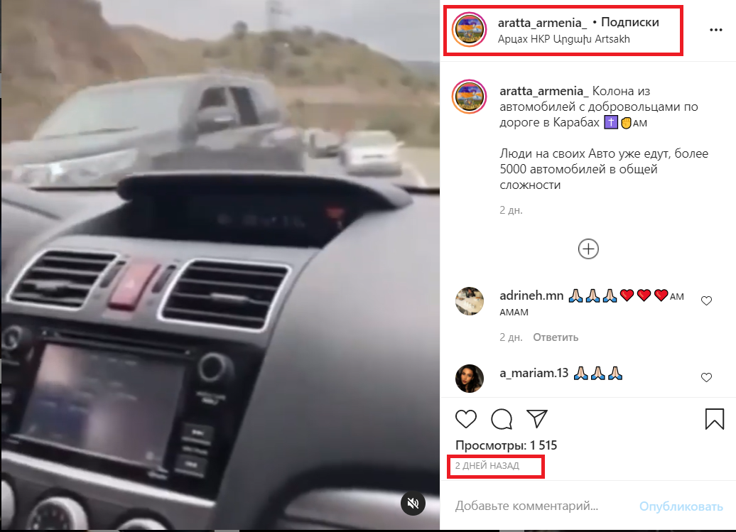 В описании опубликованного видео на странице в Instagram было написано: «Колонна машин с добровольцами по дороге в Карабах».
