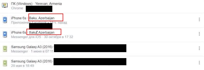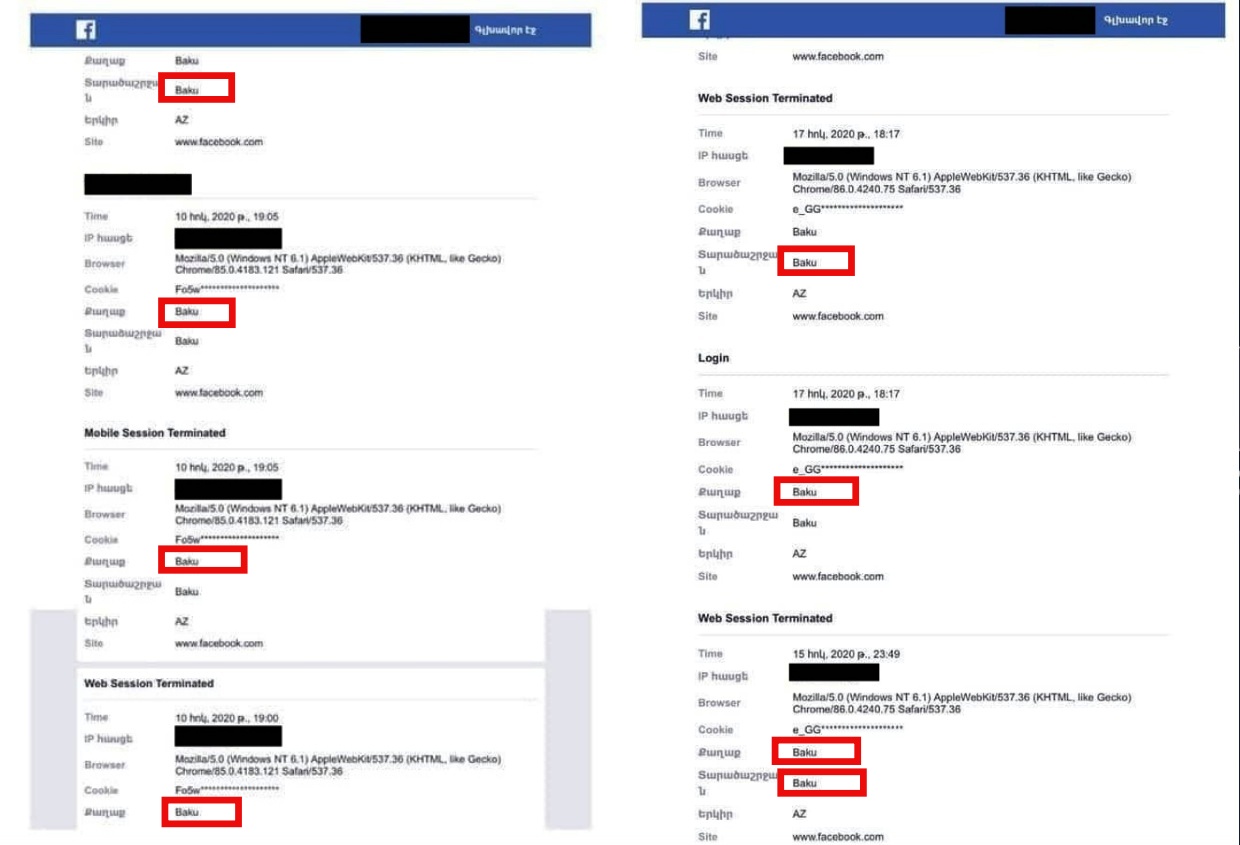 Доказательства свидетельствуют о том, что эти страницы или учетные записи социальных сетей активируются из доменов азербайджанского IP (Internet Protocol), каждый раз осуществляя вход с разных устройств: компьютера, мобильного телефона, iPad.